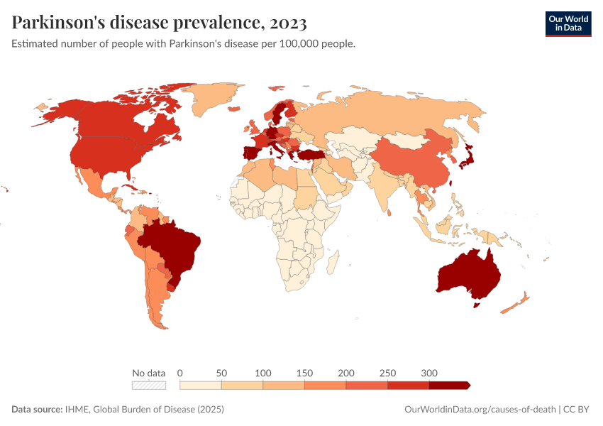 “Data Page: Parkinson's disease prevalence”, part of the following publication: Esteban Ortiz-Ospina and Max Roser (2016) - “Global Health”. Data adapted from IHME, Global Burden of Disease. Retrieved from https://index-dataset-dim.owid.pages.dev/grapher/parkinsons-disease-prevalence-ihme [online resource]How to cite this data