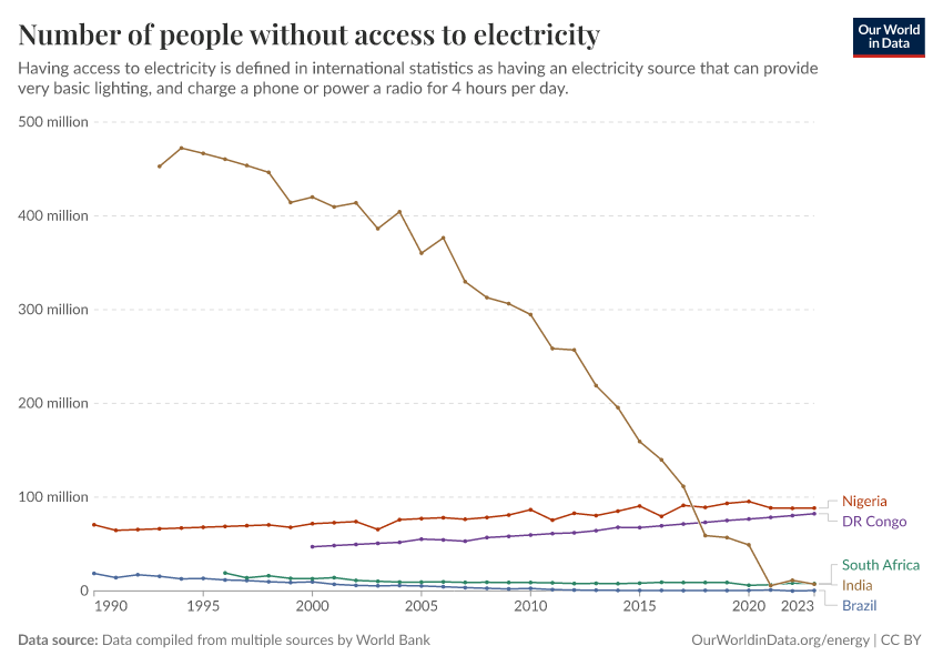 “Data Page: Number of people without access to electricity”, part of the following publication: Hannah Ritchie, Pablo Rosado, and Max Roser (2019) - “Access to Energy”. Data adapted from SDG 7.1.1 Electrification Dataset, World Bank, via World Bank, United Nations Population Division, national statistical offices, and Eurostat, via World Bank. Retrieved from https://index-dataset-dim.owid.pages.dev/grapher/people-without-electricity-country [online resource]How to cite this data