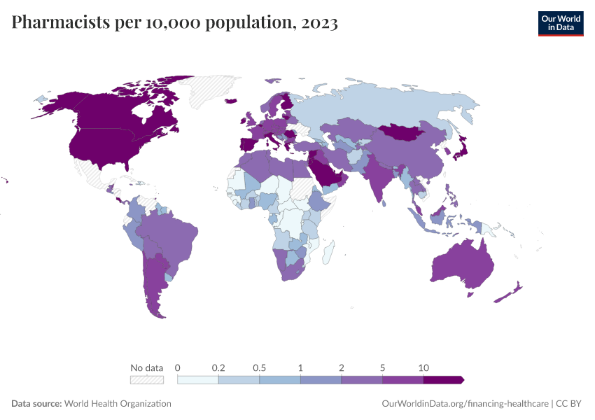 “Data Page: Pharmacists per 10,000 population”. Our World in Data (2026). Data adapted from World Health Organization. Retrieved from https://index-dataset-dim.owid.pages.dev/grapher/pharmaceutical-personnel-per-1000 [online resource]How to cite this data