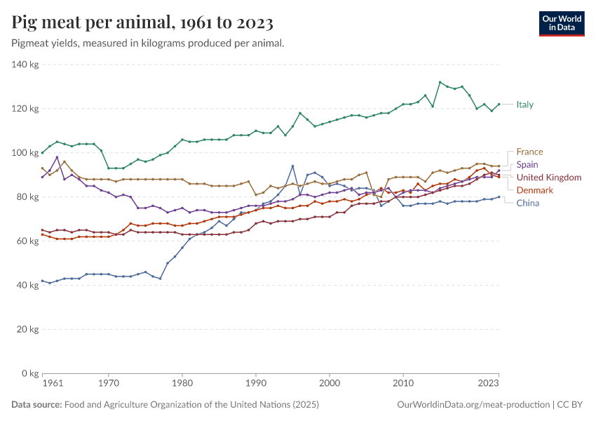“Data Page: Pig meat yield per animal”, part of the following publication: Hannah Ritchie, Pablo Rosado, and Max Roser (2023) - “Agricultural Production”. Data adapted from Food and Agriculture Organization of the United Nations. Retrieved from https://index-dataset-dim.owid.pages.dev/grapher/pig-yields-meat-per-animal-in-hectograms-100-grams [online resource]How to cite this data