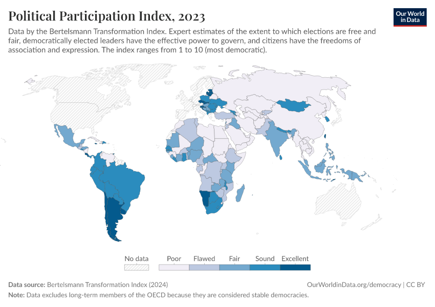“Data Page: Political Participation Index”, part of the following publication: Bastian Herre, Lucas Rodés-Guirao, and Esteban Ortiz-Ospina (2013) - “Democracy”. Data adapted from Bertelsmann Transformation Index. Retrieved from https://index-dataset-dim.owid.pages.dev/grapher/political-participation-index-bti [online resource]How to cite this data