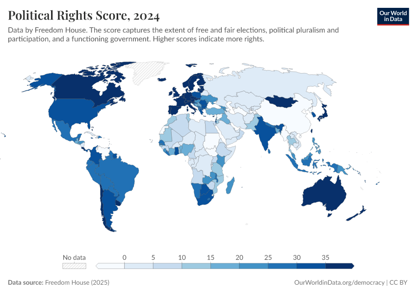 Freedom House (2025) – processed by Our World in Data. “Political rights score” [dataset]. Freedom House, “Freedom in the World” [original data]. Retrieved February 13, 2026 from https://index-dataset-dim.owid.pages.dev/grapher/political-rights-score-fh