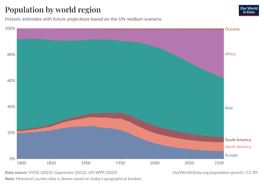“Data Page: Population by world region”, part of the following publication: Hannah Ritchie, Lucas Rodés-Guirao, Edouard Mathieu, Marcel Gerber, Esteban Ortiz-Ospina, Joe Hasell, and Max Roser (2023) - “Population Growth”. Data adapted from PBL Netherlands Environmental Assessment Agency, Gapminder, United Nations. Retrieved from https://index-dataset-dim.owid.pages.dev/grapher/population-regions-with-projections [online resource]How to cite this data
