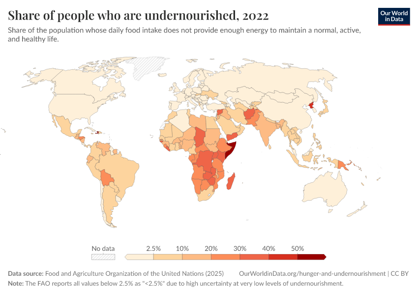 • Many countries, especially high-income ones, are shown at 2.5% because the FAO reports values between 0% and 2.5% as "<2.5%", due to uncertainty at very low levels of undernourishment.