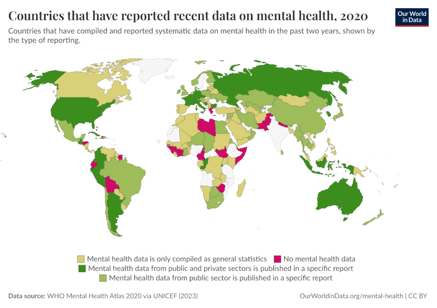 “Data Page: Countries that have reported recent data on mental health”, part of the following publication: Saloni Dattani, Lucas Rodés-Guirao, Hannah Ritchie, and Max Roser (2023) - “Mental Health”. Data adapted from WHO Mental Health Atlas 2020 via UNICEF. Retrieved from https://index-dataset-dim.owid.pages.dev/grapher/reporting-of-mental-health-system-data-in-the-past-two-years [online resource]How to cite this data