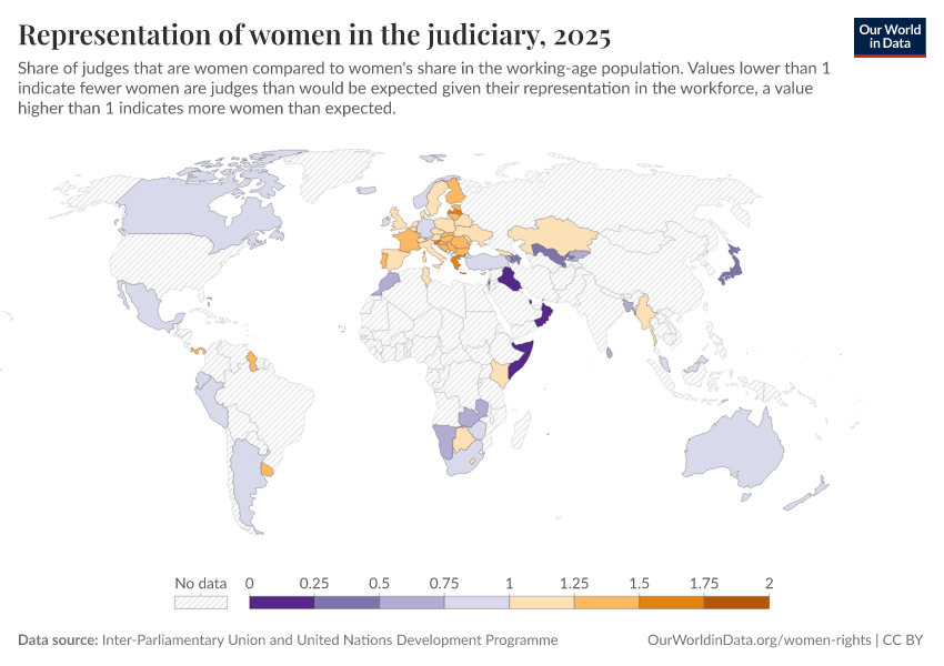 “Data Page: Representation of women in the judiciary”. Our World in Data (2026). Data adapted from Inter-Parliamentary Union and United Nations Development Programme. Retrieved from https://index-dataset-dim.owid.pages.dev/grapher/representation-of-women-in-the-judiciary [online resource]How to cite this data
