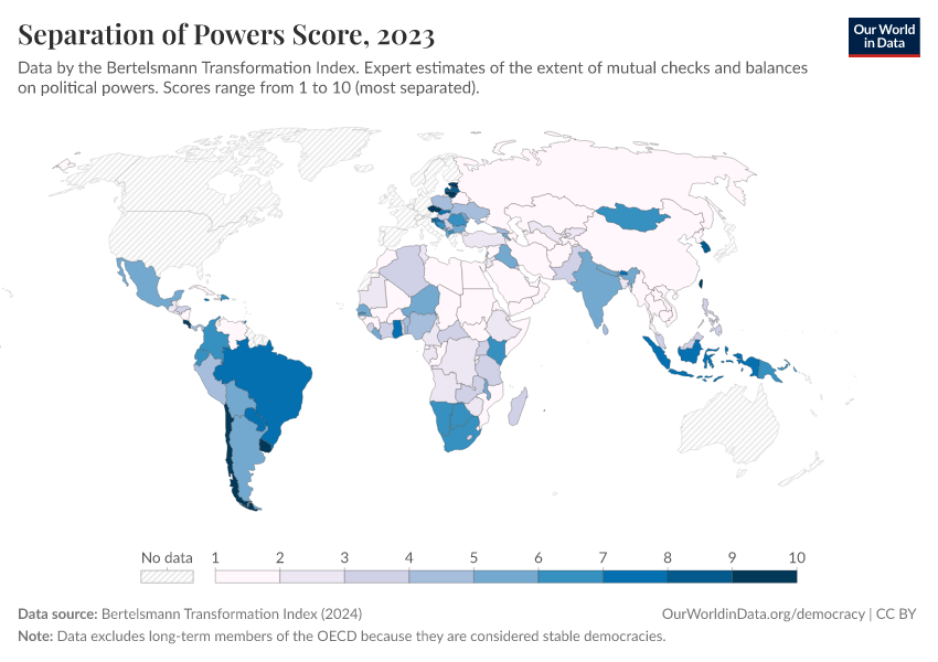 “Data Page: Separation of powers score”, part of the following publication: Bastian Herre, Lucas Rodés-Guirao, and Esteban Ortiz-Ospina (2013) - “Democracy”. Data adapted from Bertelsmann Transformation Index. Retrieved from https://index-dataset-dim.owid.pages.dev/grapher/separation-of-powers-score-bti [online resource]How to cite this data