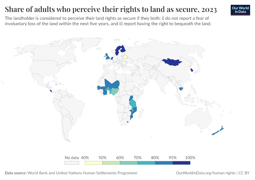 World Bank and United Nations Human Settlements Programme – processed by Our World in Data. “Share of adults who perceive their rights to land as secure” [dataset]. World Bank and United Nations Human Settlements Programme, “Data from multiple sources” [original data]. Retrieved February 13, 2026 from https://index-dataset-dim.owid.pages.dev/grapher/share-of-adults-who-perceive-their-rights-to-land-as-secure