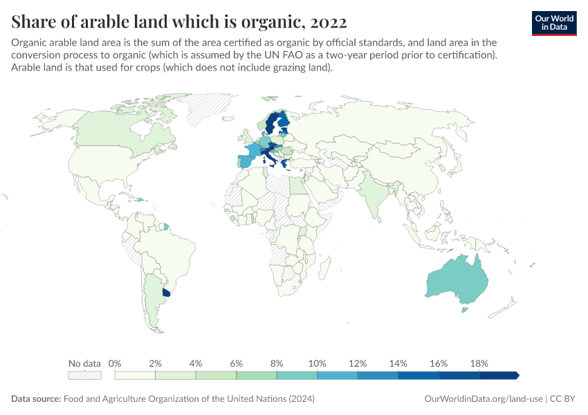 “Data Page: Share of arable land that is organic”, part of the following publication: Hannah Ritchie, Pablo Rosado, and Max Roser (2023) - “Agricultural Production”. Data adapted from Food and Agriculture Organization of the United Nations. Retrieved from https://index-dataset-dim.owid.pages.dev/grapher/share-of-arable-land-which-is-organic [online resource]How to cite this data