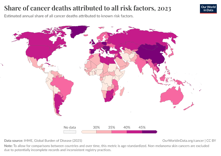 “Data Page: Share of cancer deaths attributed to all risk factors”, part of the following publication: Esteban Ortiz-Ospina and Max Roser (2016) - “Global Health”. Data adapted from IHME, Global Burden of Disease. Retrieved from https://index-dataset-dim.owid.pages.dev/grapher/share-of-cancer-deaths-attributed-to-all-risk-factors [online resource]How to cite this data