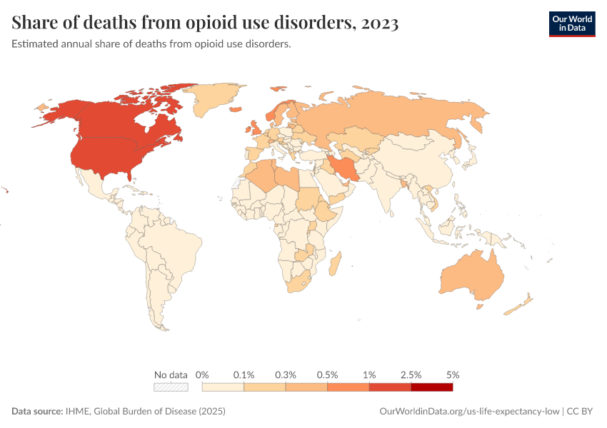 IHME, Global Burden of Disease (2024) – with minor processing by Our World in Data. “Share of deaths from opioid use disorders” [dataset]. IHME, Global Burden of Disease, “Global Burden of Disease - Deaths and DALYs” [original data]. Retrieved February 13, 2026 from https://index-dataset-dim.owid.pages.dev/grapher/share-of-deaths-from-opioid-overdoses