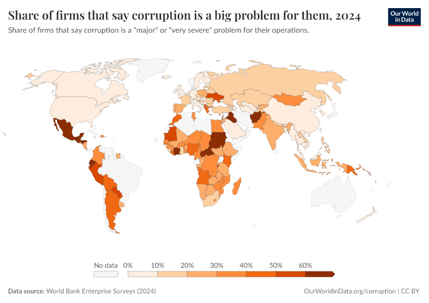 World Bank Enterprise Surveys (2024) – with minor processing by Our World in Data. “Share of firms that say corruption is a big problem for them” [dataset]. World Bank Enterprise Surveys, “Enterprise Surveys - Corruption” [original data]. Retrieved February 13, 2026 from https://index-dataset-dim.owid.pages.dev/grapher/share-of-firms-that-say-corruption-is-a-big-problem-for-them
