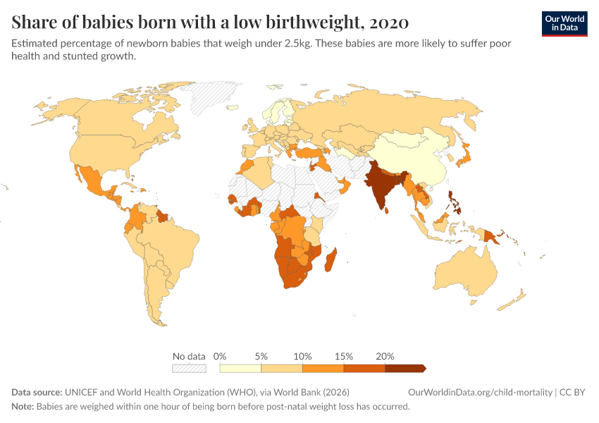 “Data Page: Share of babies born with a low birthweight”. Our World in Data (2026). Data adapted from UNICEF and World Health Organization (WHO), via World Bank. Retrieved from https://index-dataset-dim.owid.pages.dev/grapher/share-of-low-birthweight-babies-born [online resource]How to cite this data