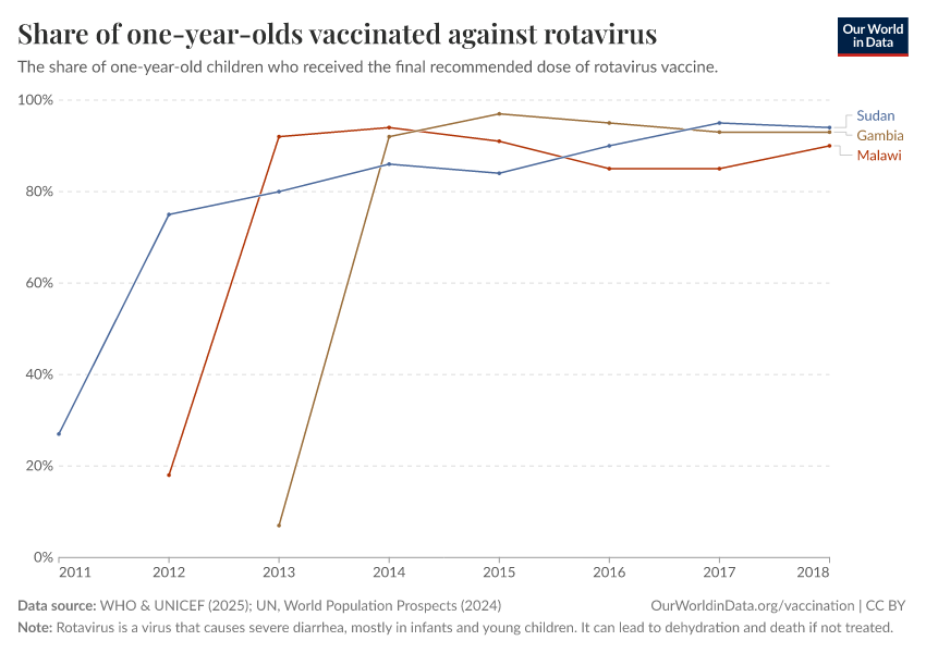 “Data Page: Share of one-year-olds vaccinated against rotavirus”, part of the following publication: Fiona Spooner, Saloni Dattani, Samantha Vanderslott, and Max Roser (2022) - “Vaccination”. Data adapted from WHO & UNICEF, United Nations. Retrieved from https://index-dataset-dim.owid.pages.dev/grapher/share-of-one-year-olds-who-received-the-rotavirus-vaccine [online resource]How to cite this data