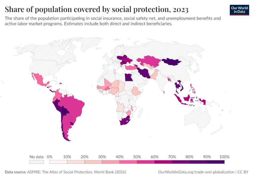 “Data Page: Share of population covered by social protection”. Our World in Data (2026). Data adapted from ASPIRE: The Atlas of Social Protection, World Bank. Retrieved from https://index-dataset-dim.owid.pages.dev/grapher/share-of-population-covered-by-social-protection [online resource]How to cite this data