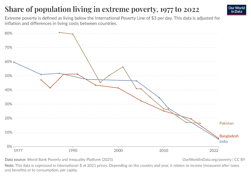 World Bank Poverty and Inequality Platform (2025) – with major processing by Our World in Data. “Share of population living in extreme poverty – World Bank” [dataset]. World Bank Poverty and Inequality Platform, “World Bank Poverty and Inequality Platform (PIP) 20250930_2021, 20250930_2017” [original data]. Retrieved February 13, 2026 from https://index-dataset-dim.owid.pages.dev/grapher/share-of-population-in-extreme-poverty