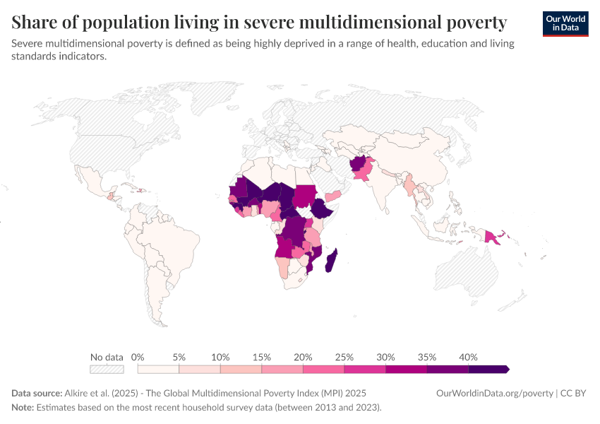 “Data Page: Share of population living in severe multidimensional poverty”, part of the following publication: Joe Hasell, Bertha Rohenkohl, Pablo Arriagada, Esteban Ortiz-Ospina, and Max Roser (2022) - “Poverty”. Data adapted from Alkire et al.. Retrieved from https://index-dataset-dim.owid.pages.dev/grapher/share-of-population-in-severe-multidimensional-poverty [online resource]How to cite this data