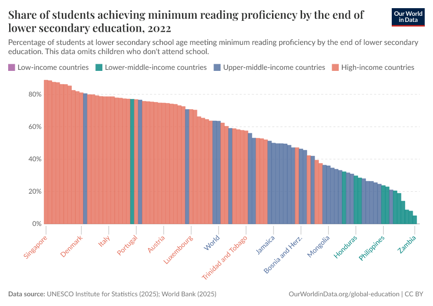 “Data Page: Share of students achieving minimum reading proficiency by the end of lower secondary education”, part of the following publication: Hannah Ritchie, Veronika Samborska, Esteban Ortiz-Ospina, and Max Roser (2023) - “Global Education”. Data adapted from UNESCO Institute for Statistics. Retrieved from https://index-dataset-dim.owid.pages.dev/grapher/share-of-students-at-end-of-lower-secondary-education-with-minimum-reading-proficiency [online resource]How to cite this data