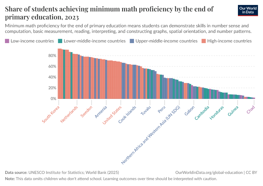 UNESCO Institute for Statistics – processed by Our World in Data. “Share of students achieving minimum math proficiency by the end of primary education” [dataset]. UNESCO Institute for Statistics, “Data from multiple sources” [original data]. Retrieved February 13, 2026 from https://index-dataset-dim.owid.pages.dev/grapher/share-of-students-at-end-of-primary-education-achieving-minimum-math-proficiency