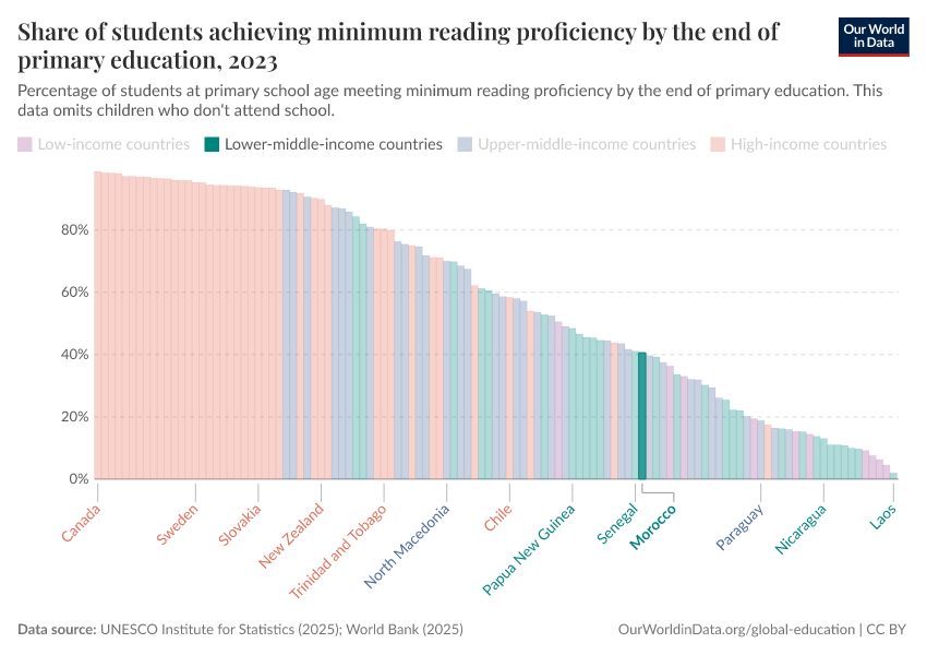 “Data Page: Share of students achieving minimum reading proficiency by the end of primary education”, part of the following publication: Hannah Ritchie, Veronika Samborska, Esteban Ortiz-Ospina, and Max Roser (2023) - “Global Education”. Data adapted from UNESCO Institute for Statistics. Retrieved from https://index-dataset-dim.owid.pages.dev/grapher/share-of-students-at-end-of-primary-education-achieving-minimum-reading-proficiency [online resource]