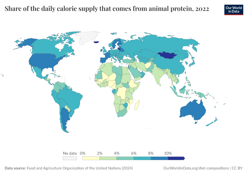 “Data Page: Share of the daily calorie supply that comes from animal protein”, part of the following publication: Hannah Ritchie, Pablo Rosado, and Max Roser (2023) - “Agricultural Production”. Data adapted from Food and Agriculture Organization of the United Nations. Retrieved from https://index-dataset-dim.owid.pages.dev/grapher/share-of-the-daily-calorie-supply-that-comes-from-animal-protein [online resource]How to cite this data