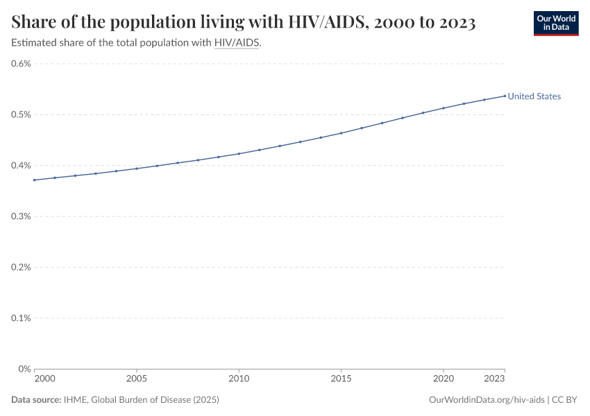 IHME, Global Burden of Disease (2024) – with major processing by Our World in Data. “Share of the population living with HIV/AIDS” [dataset]. IHME, Global Burden of Disease, “Global Burden of Disease - Prevalence” [original data]. Retrieved February 13, 2026 from https://index-dataset-dim.owid.pages.dev/grapher/share-of-the-population-living-with-hivaids