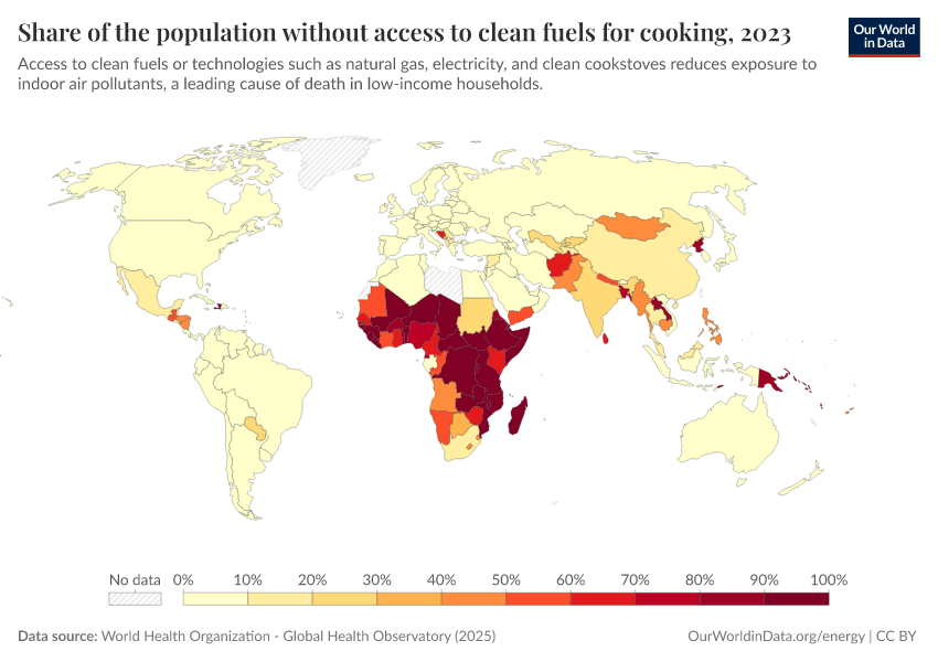 World Health Organization - Global Health Observatory (2025) – processed by Our World in Data. “Share of the population without access to clean fuels for cooking” [dataset]. World Health Organization, “Global Health Observatory” [original data]. Retrieved February 13, 2026 from https://index-dataset-dim.owid.pages.dev/grapher/share-of-the-population-without-access-to-clean-fuels-for-cooking