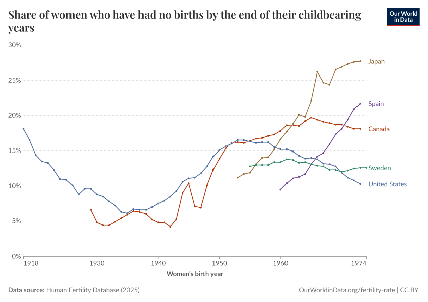 “Data Page: Share of women who have had no births by the end of their childbearing years”, part of the following publication: Saloni Dattani, Lucas Rodés-Guirao, and Max Roser (2025) - “Fertility Rate”. Data adapted from Human Fertility Database. Retrieved from https://index-dataset-dim.owid.pages.dev/grapher/share-of-women-who-have-had-no-births-across-their-childbearing-years [online resource]How to cite this data