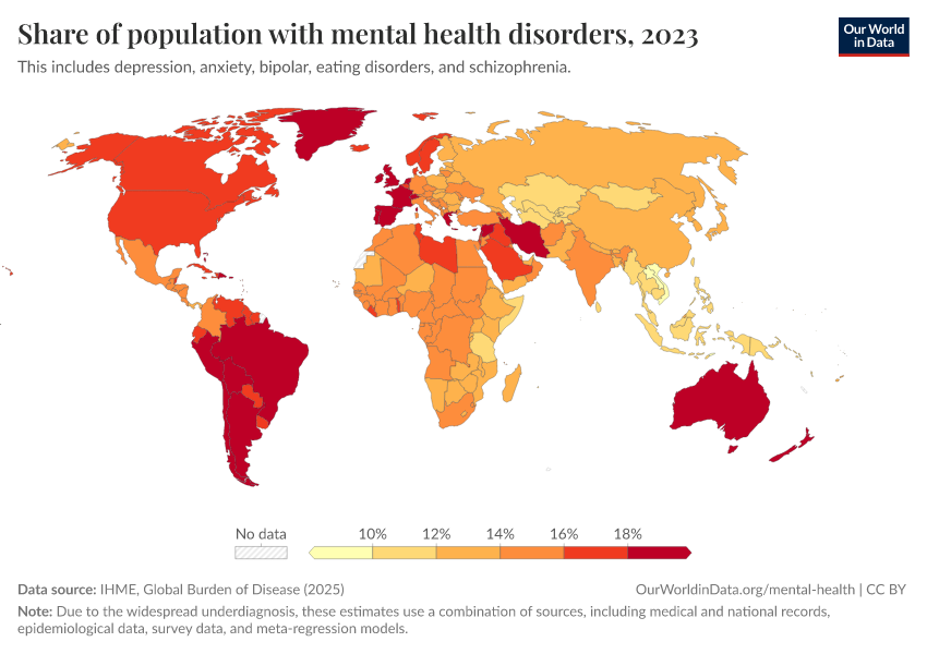 “Data Page: Share of population with mental health disorders”, part of the following publication: Esteban Ortiz-Ospina and Max Roser (2016) - “Global Health”. Data adapted from IHME, Global Burden of Disease. Retrieved from https://index-dataset-dim.owid.pages.dev/grapher/share-with-mental-and-substance-disorders [online resource]How to cite this data