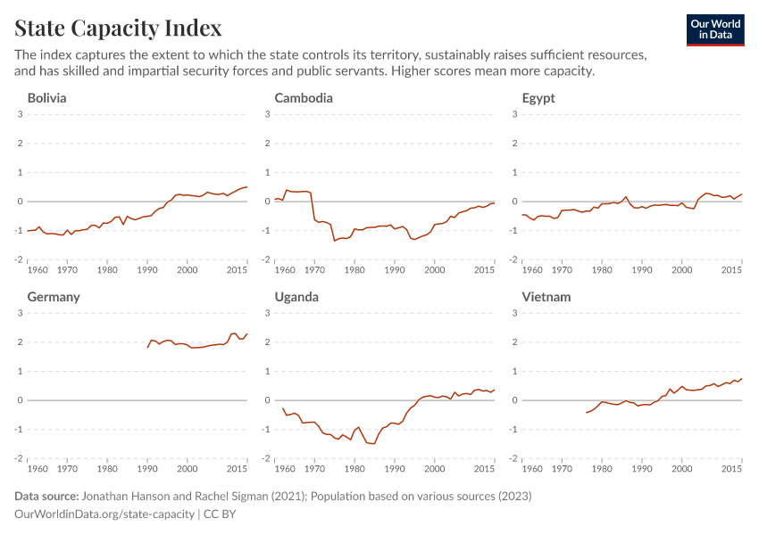 “Data Page: State Capacity Index”, part of the following publication: Bastian Herre and Pablo Arriagada (2023) - “State Capacity”. Data adapted from Jonathan Hanson and Rachel Sigman, Various sources. Retrieved from https://index-dataset-dim.owid.pages.dev/grapher/state-capacity-index [online resource]