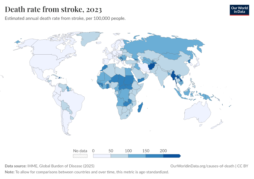 IHME, Global Burden of Disease (2024) – with minor processing by Our World in Data. “Death rate from stroke” [dataset]. IHME, Global Burden of Disease, “Global Burden of Disease - Deaths and DALYs” [original data]. Retrieved February 13, 2026 from https://index-dataset-dim.owid.pages.dev/grapher/stroke-death-rates