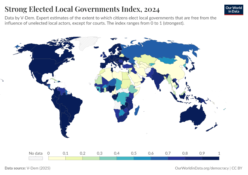 “Data Page: Elected local governments”, part of the following publication: Bastian Herre, Lucas Rodés-Guirao, and Esteban Ortiz-Ospina (2013) - “Democracy”. Data adapted from V-Dem. Retrieved from https://index-dataset-dim.owid.pages.dev/grapher/strong-elected-local-governments-index [online resource]How to cite this data