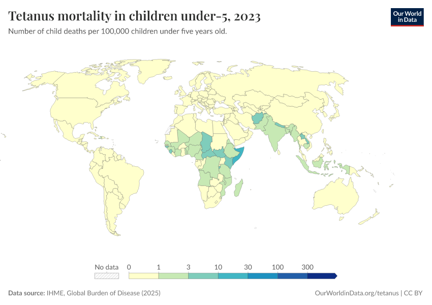 IHME, Global Burden of Disease (2024) – with minor processing by Our World in Data. “Tetanus mortality in children under-5” [dataset]. IHME, Global Burden of Disease, “Global Burden of Disease - Deaths and DALYs” [original data]. Retrieved February 13, 2026 from https://index-dataset-dim.owid.pages.dev/grapher/tetanus-mortality-in-children-under-5