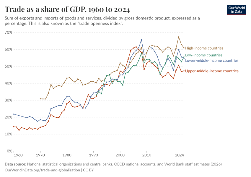 “Data Page: Trade as a share of GDP”. Our World in Data (2026). Data adapted from National statistical organizations and central banks, OECD national accounts, and World Bank staff estimates. Retrieved from https://index-dataset-dim.owid.pages.dev/grapher/trade-as-share-of-gdp [online resource]