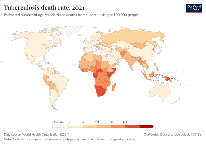 “Data Page: Tuberculosis death rate”, part of the following publication: Esteban Ortiz-Ospina and Max Roser (2016) - “Global Health”. Data adapted from World Health Organization. Retrieved from https://index-dataset-dim.owid.pages.dev/grapher/tuberculosis-death-rate-age-standardized [online resource]How to cite this data