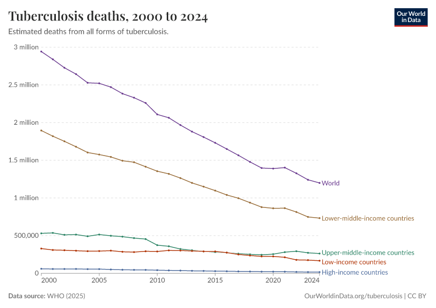 WHO (2024) – with minor processing by Our World in Data. “Tuberculosis deaths” [dataset]. WHO, “Global Tuberculosis Report - Burden Estimates” [original data]. Retrieved February 13, 2026 from https://index-dataset-dim.owid.pages.dev/grapher/tuberculosis-deaths-who