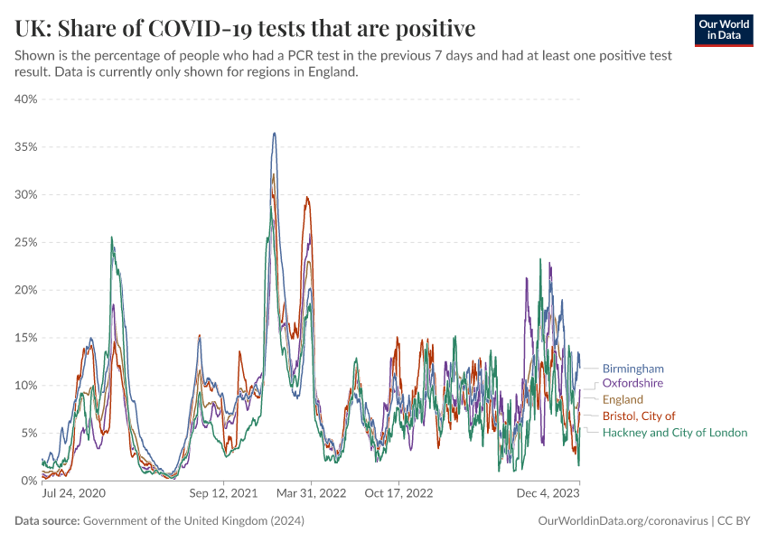 Government of the United Kingdom (2024) – with minor processing by Our World in Data. “UK: Share of COVID-19 tests that are positive” [dataset]. Government of the United Kingdom, “UKHSA data dashboard” [original data]. Retrieved February 13, 2026 from https://index-dataset-dim.owid.pages.dev/grapher/uk-covid-positivity