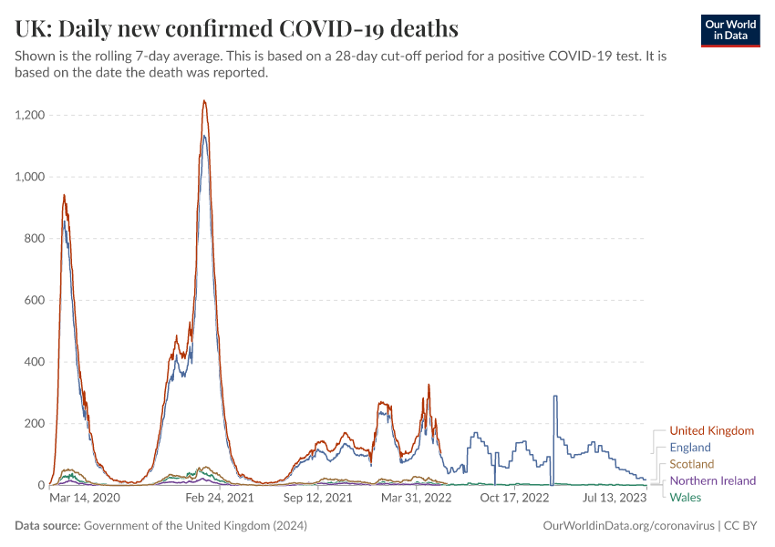 Government of the United Kingdom (2024) – with minor processing by Our World in Data. “UK: Daily new confirmed COVID-19 deaths” [dataset]. Government of the United Kingdom, “UKHSA data dashboard” [original data]. Retrieved February 13, 2026 from https://index-dataset-dim.owid.pages.dev/grapher/uk-daily-covid-deaths
