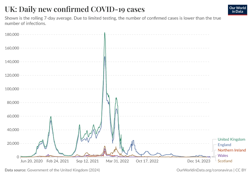 Government of the United Kingdom (2024) – with minor processing by Our World in Data. “UK: Daily new confirmed COVID-19 cases” [dataset]. Government of the United Kingdom, “UKHSA data dashboard” [original data]. Retrieved February 13, 2026 from https://index-dataset-dim.owid.pages.dev/grapher/uk-daily-new-covid-cases