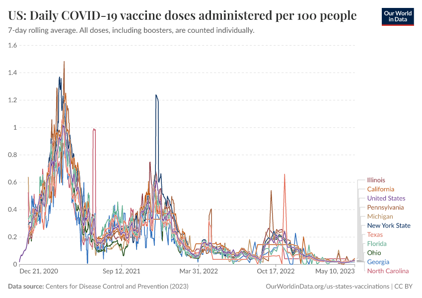 Centers for Disease Control and Prevention (2023) – processed by Our World in Data. “US: Daily COVID-19 vaccine doses administered per 100 people” [dataset]. Centers for Disease Control and Prevention, “COVID-19, Vaccinations (United States)” [original data]. Retrieved February 13, 2026 from https://index-dataset-dim.owid.pages.dev/grapher/us-daily-covid-vaccine-doses-per-100