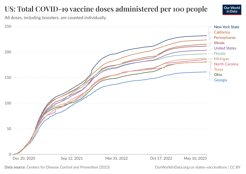 “Data Page: US: Total COVID-19 vaccine doses administered per 100 people”, part of the following publication: Edouard Mathieu, Hannah Ritchie, Lucas Rodés-Guirao, Cameron Appel, Daniel Gavrilov, Charlie Giattino, Joe Hasell, Bobbie Macdonald, Saloni Dattani, Diana Beltekian, Esteban Ortiz-Ospina, and Max Roser (2020) - “COVID-19 Pandemic”. Data adapted from Centers for Disease Control and Prevention. Retrieved from https://index-dataset-dim.owid.pages.dev/grapher/us-state-covid-vaccines-per-100 [online resource]How to cite this data
