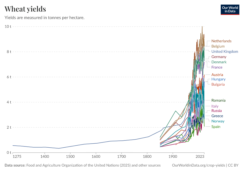 Food and Agriculture Organization of the United Nations (2025); Broadberry et al. (2015); Brassley (2000); Bayliss-Smith & Wanmali (1984) – with major processing by Our World in Data. “Wheat yields” [dataset]. Food and Agriculture Organization of the United Nations, “Production: Crops and livestock products”; Broadberry et al., “Long-term crop yields in UK”; Brassley, “Long-term crop yields in UK”; Bayliss-Smith & Wanmali, “Understanding Green Revolutions” [original data]. Retrieved February 13, 2026 from https://index-dataset-dim.owid.pages.dev/grapher/wheat-yields