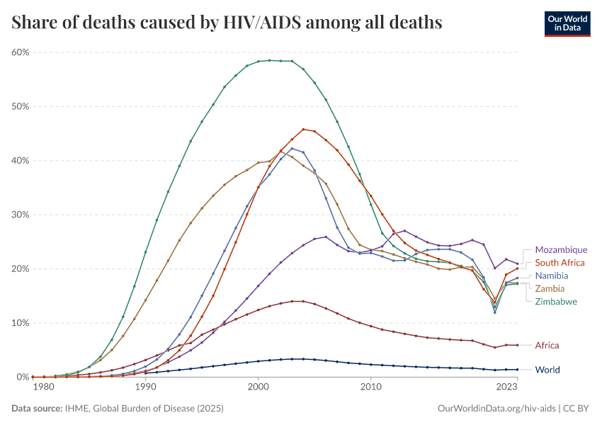 In the visualization, we see the change in the share of deaths from HIV/AIDS over time. From the 1990s through to the early 2000s, it was the cause of more than 1 in 3 deaths in several countries and even more than half of annual deaths in the late 1990s in Zimbabwe.