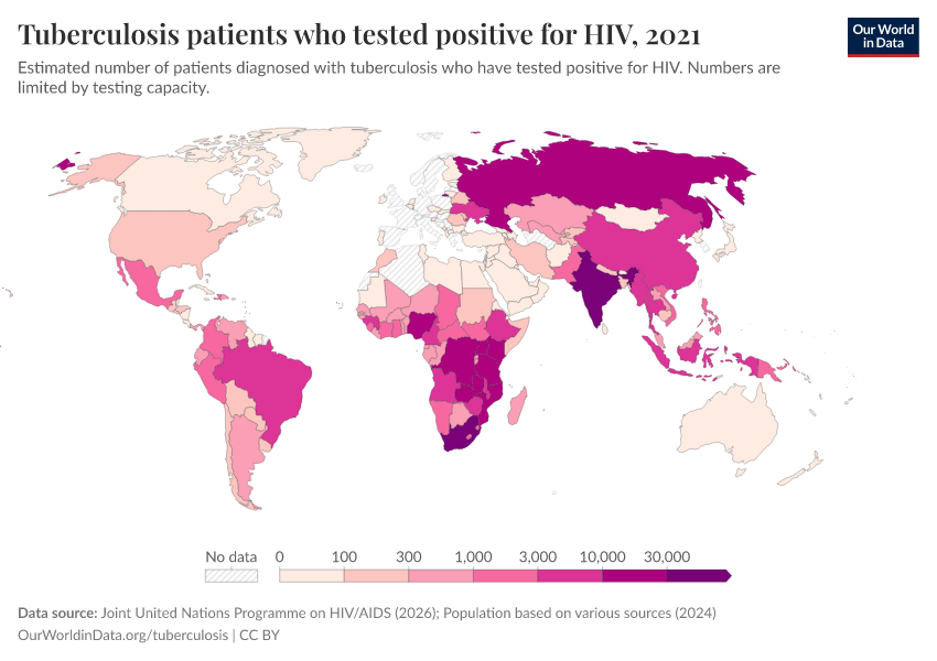 Tuberculosis (TB) is the leading HIV-associated opportunistic infection in low- and middle-income countries, and it is a leading cause of death globally among people living with HIV. Death due to tuberculosis remains high among people living with HIV. However, the number of deaths is decreasing. Most of the global mortality due to TB among those with HIV is from cases in Sub-Saharan Africa.