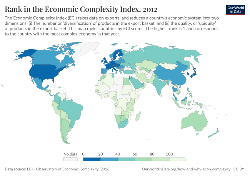 By this logic, Germany ranks high in economic complexity, because it exports many different kinds of sophisticated things that are only produced by a handful of other countries with similarly diversified productive capacities.