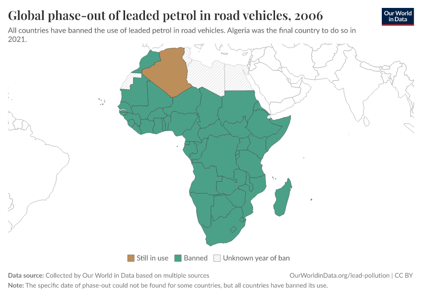 Hannah Ritchie (2022) - “How the world eliminated lead from gasoline” Published online at OurWorldinData.org. Retrieved from: 'https://index-dataset-dim.owid.pages.dev/leaded-gasoline-phase-out' [Online Resource]BibTeX citation