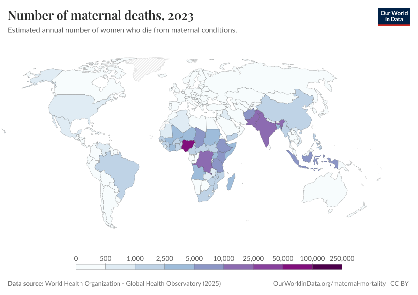 In the map, we see the annual number of pregnancy-related deaths by country. Again, this is a reflection of both the number of births each year and the risk that a mother will die as a result.