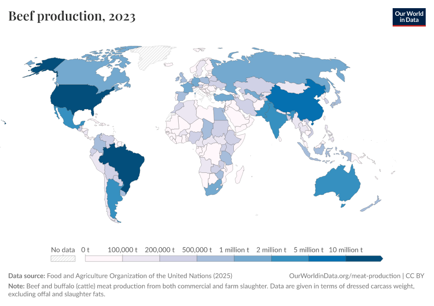 Hannah Ritchie, Pablo Rosado, and Max Roser (2019) - “Meat and Dairy Production” Published online at OurWorldinData.org. Retrieved from: 'https://index-dataset-dim.owid.pages.dev/meat-production' [Online Resource]BibTeX citation