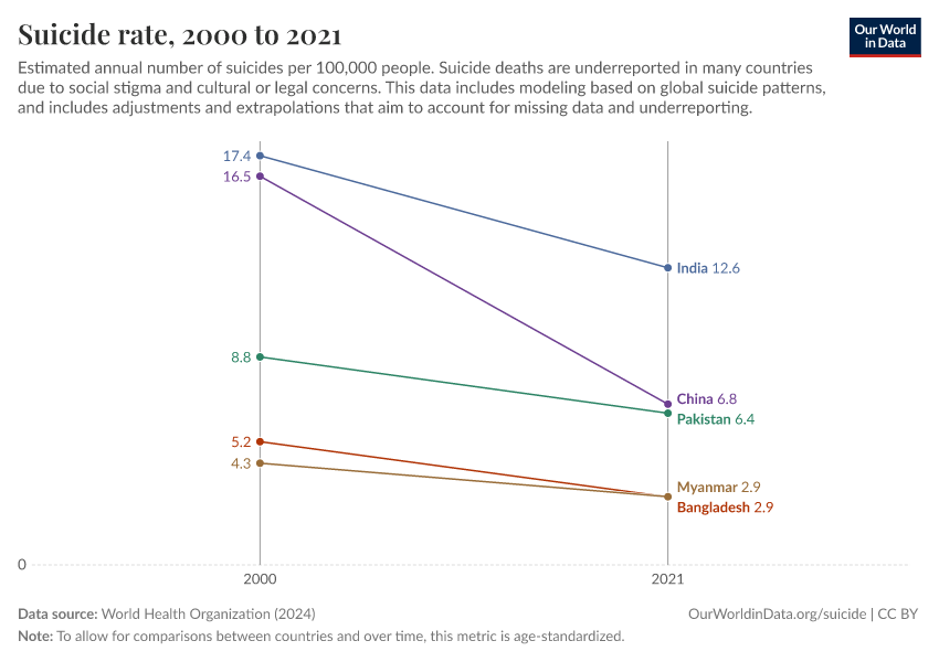 Sri Lanka is not the only country to have experienced a decline in suicides from self-poisonings. In particular, this has been the case across several Asian countries. The chart shows the change in total suicide rates across a selection of countries in South and East Asia. These countries have banned at least some HHPs over this period (some also banned selected ones before 2000). As you can see, rates have fallen to varying degrees over the past few decades.