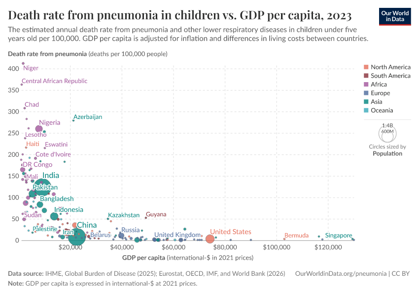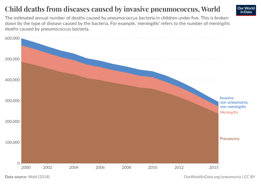On this topic page, we look at who is suffering from pneumonia and why — and what can we do to reduce the number of people dying from this disease, with interventions such as vaccination, oxygen therapy, reducing air pollution, and more.